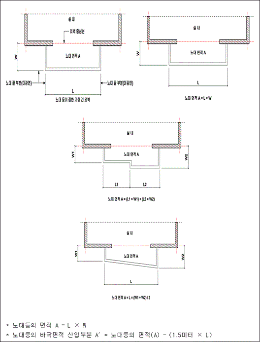 나. 건축물의 노대등의 바닥은 난간 등의 설치 여부에 관계없이 노대등의 면적(외벽의 중심선으로부터 노대 등의 끝부분까지의 면적을 말한다)에서 노대등이 접한 가장 긴 외벽에 접한 길이에 1.5미터를 곱한 값을 뺀 면적을 바닥면적에 산입한다.