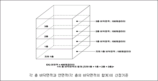 바닥 면적은 특정 층의 면적을 나타냅니다. 바닥 면적은 건물의 각 층에 대한 면적을 파악하는 데 사용되며, 건축물 대장에서 확인할 수 있습니다. 건축물의 산정기준은 건축물 외곽의 면적이 아니라 구획의 중심선으로 합니다. 주로 건축물의 구조(콘크리트 등)에 따라 중심선의 차이가 있습니다. 일반적으로 거주 또는 상업 공간의 용도별 크기를 나타냅니다.